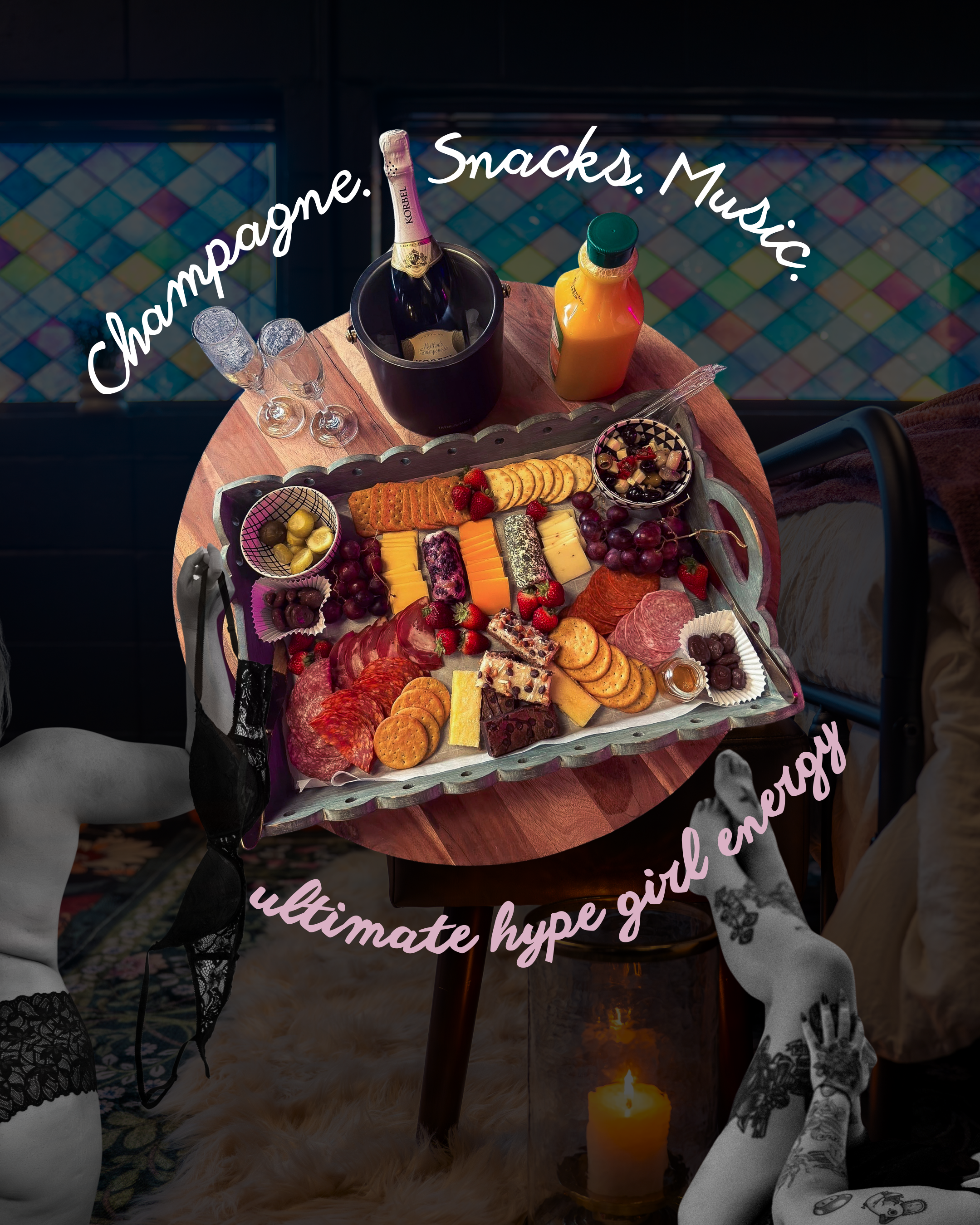 You’ll walk into a moody, music-filled space with champagne chilled, snacks waiting, and your energy already being taken care of. Within minutes, the nerves fade. The laughter starts. The music gets louder.